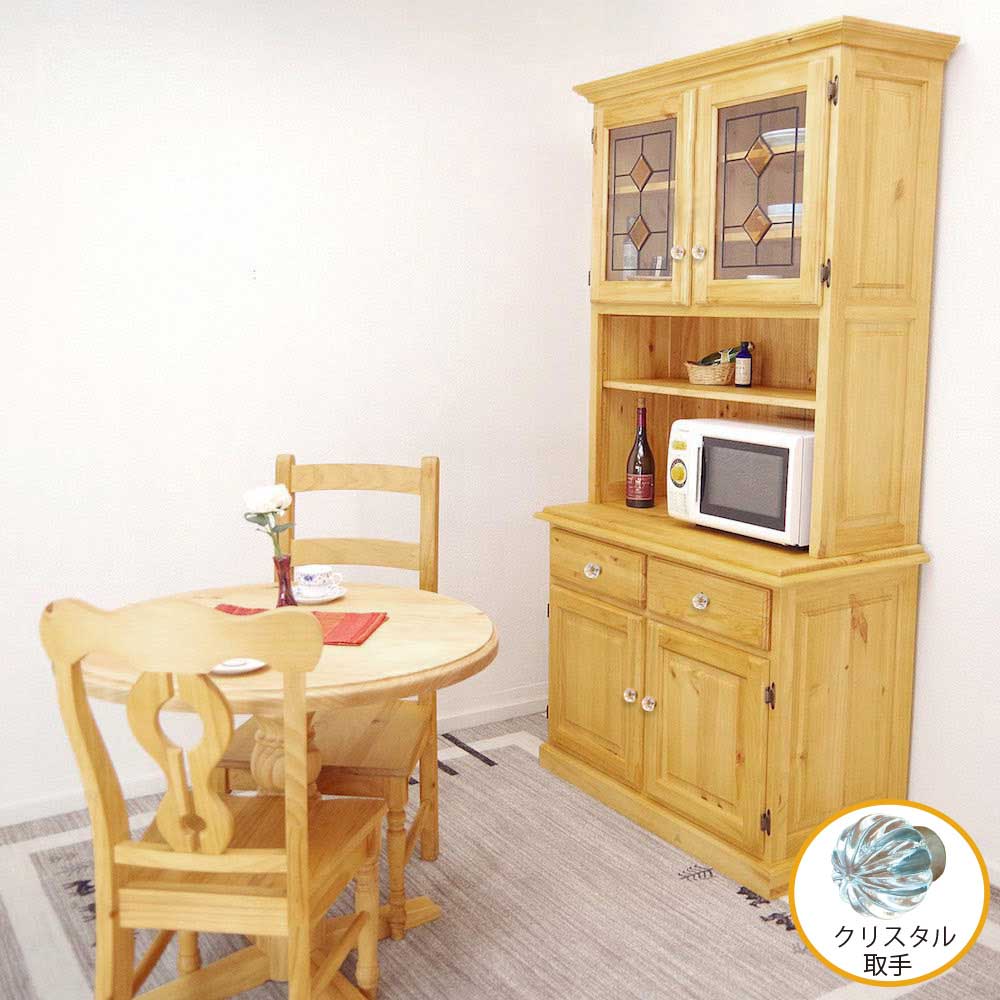パイン無垢材をふんだんにつかった カントリーデザインと本物のクリスタルガラスを使ったクリスタル取手で更にオシャレに収納できると人気です。レンジ台に、食器棚にいろいろ使えて便利です!