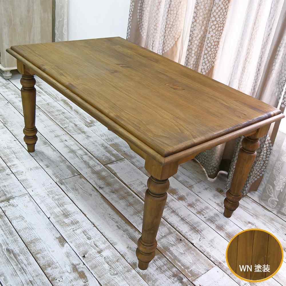 パイン材をふんだんに使った140×85cmのカントリーダイニングテーブルです♪普段は家族で!来客時はスツールなどを足して6人でわいわいと囲んだりも出来ます♪ 削り出して装飾を施した脚と面をとった天板のかわいいデザインがお部屋に柔らかい印象を与えてくれる自然素材のカントリー食卓テーブルです♪