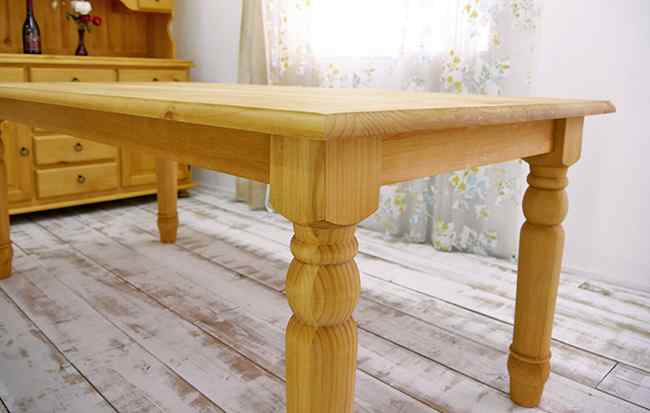 パイン材をふんだんに使ったカントリー食卓テーブルは6人でお使いいただけるワイドサイズ なので、来客の多いご家庭や店舗什器としても人気です♪削り出して装飾を施した脚と面をとった天板のかわいいデザインがステキですね♪