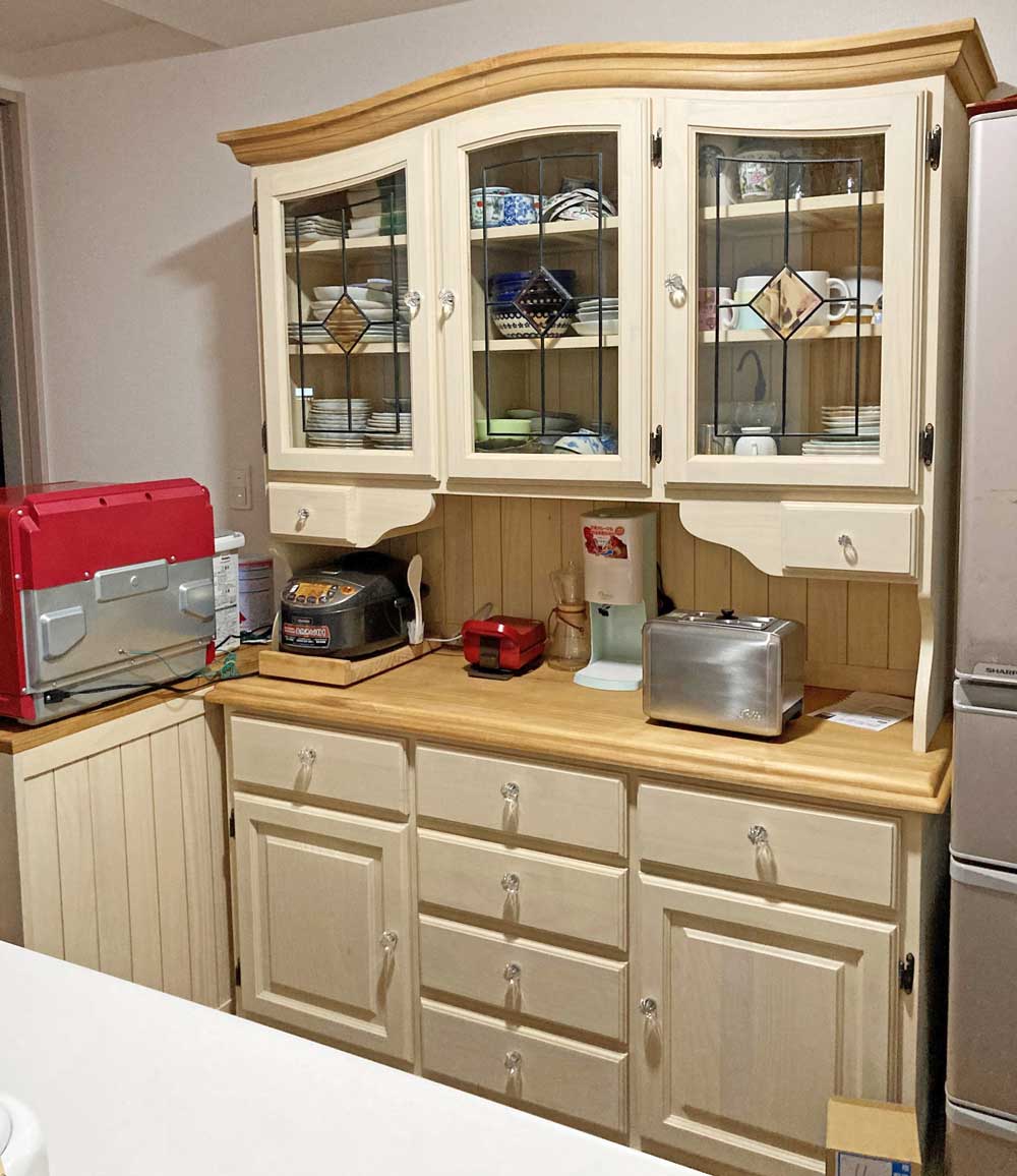 本当に素敵な食器棚です。 カウンターは縦に備えていますが、間仕切りのような役割をし、裏側もおしゃれなので違和感なく納まっております。