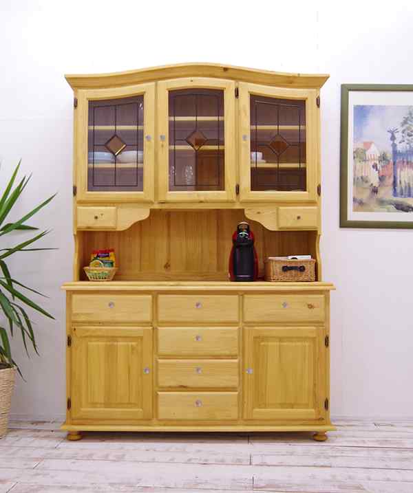 すごく可愛いです。ステンドグラス風のガラスがお気に入りです。背面も全てパイン材を使っていて、安っぽくないです。白い物と散々悩みましたが、実際運ばれてみるとお部屋に馴染んでこちらの商品で良かったです。 一年くらいお気に入りリストに入れて悩んでの購入でしたが、収納が沢山あって、引き出し出し入れもスムーズで、使い勝手も良く大満足です! ただ、戸棚の仕切りがもっと付いていたら良かったなーというのと、炊飯器が置けるスペースが伸びる引き出しが付いていたら良かったなー