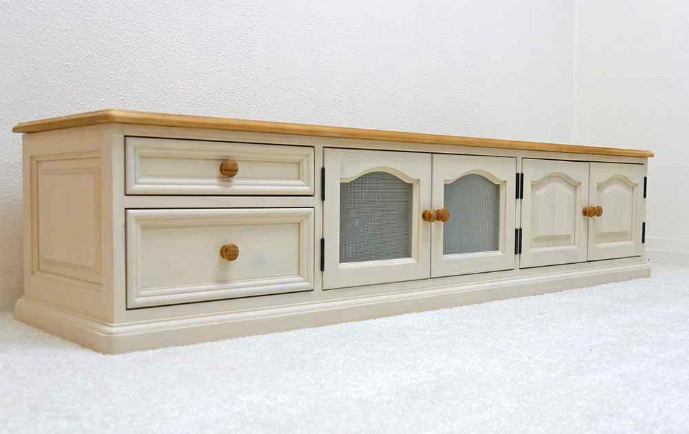 天板の端部のやわらかい面取りデザインや扉・本体サイドの凹凸のある浮き彫り仕上げのデザインがとっても素敵です♪ 細部までこだわったやわらかいデザインがかわいいカントリーローテレビボードです