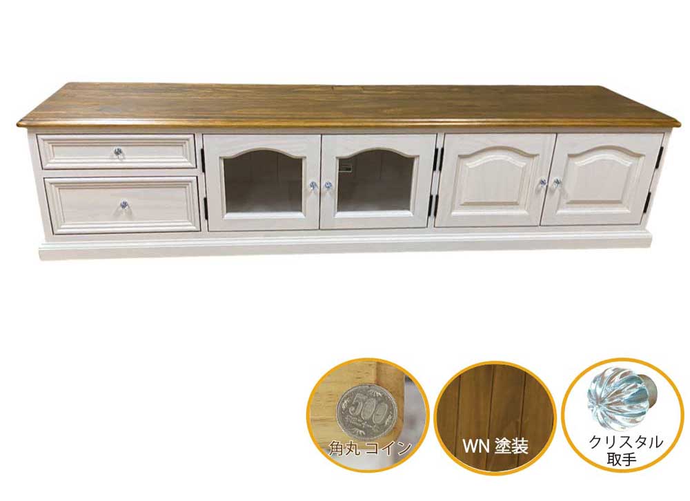 【角丸コインR天板&台輪4ヵ所】テレビボード巾180cm高さ40cm(ミルキーホワイト色)|ガラス扉|クリスタル取手