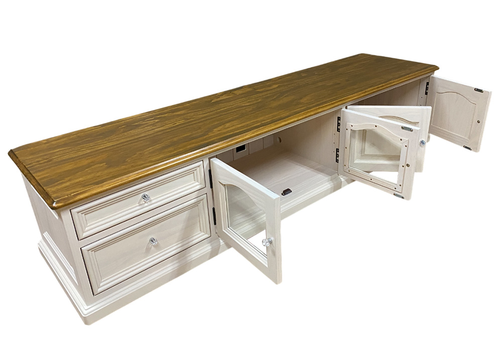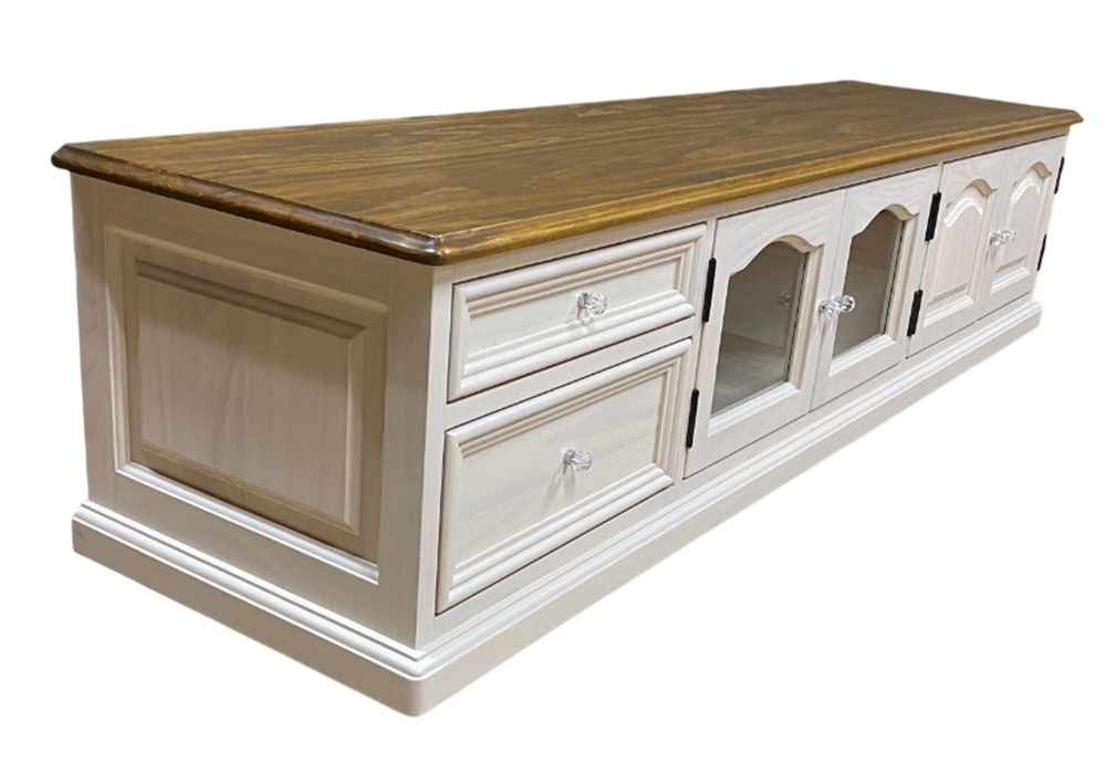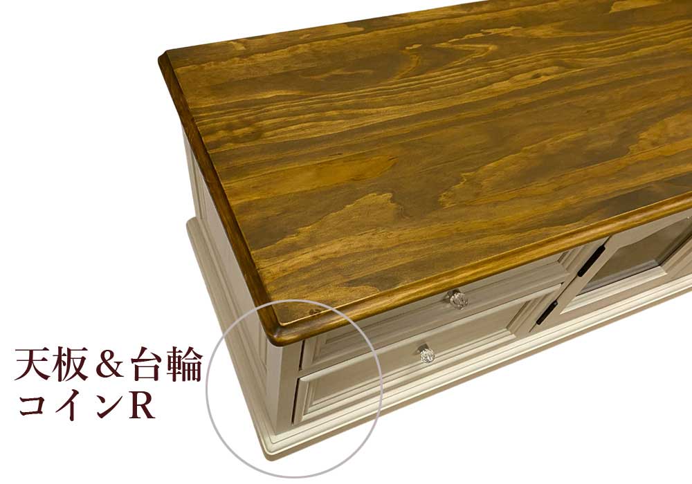 天板の端部のやわらかい面取りデザインや扉・本体サイドの凹凸のある浮き彫り仕上げのデザインがとっても素敵です♪ 細部までこだわったやわらかいデザインがかわいいカントリーローテレビボードです