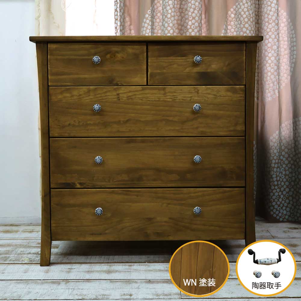 可愛らしさの中にウォルナットが重厚感を増し存在感があるチェストに仕上がっています。