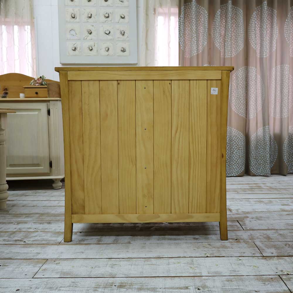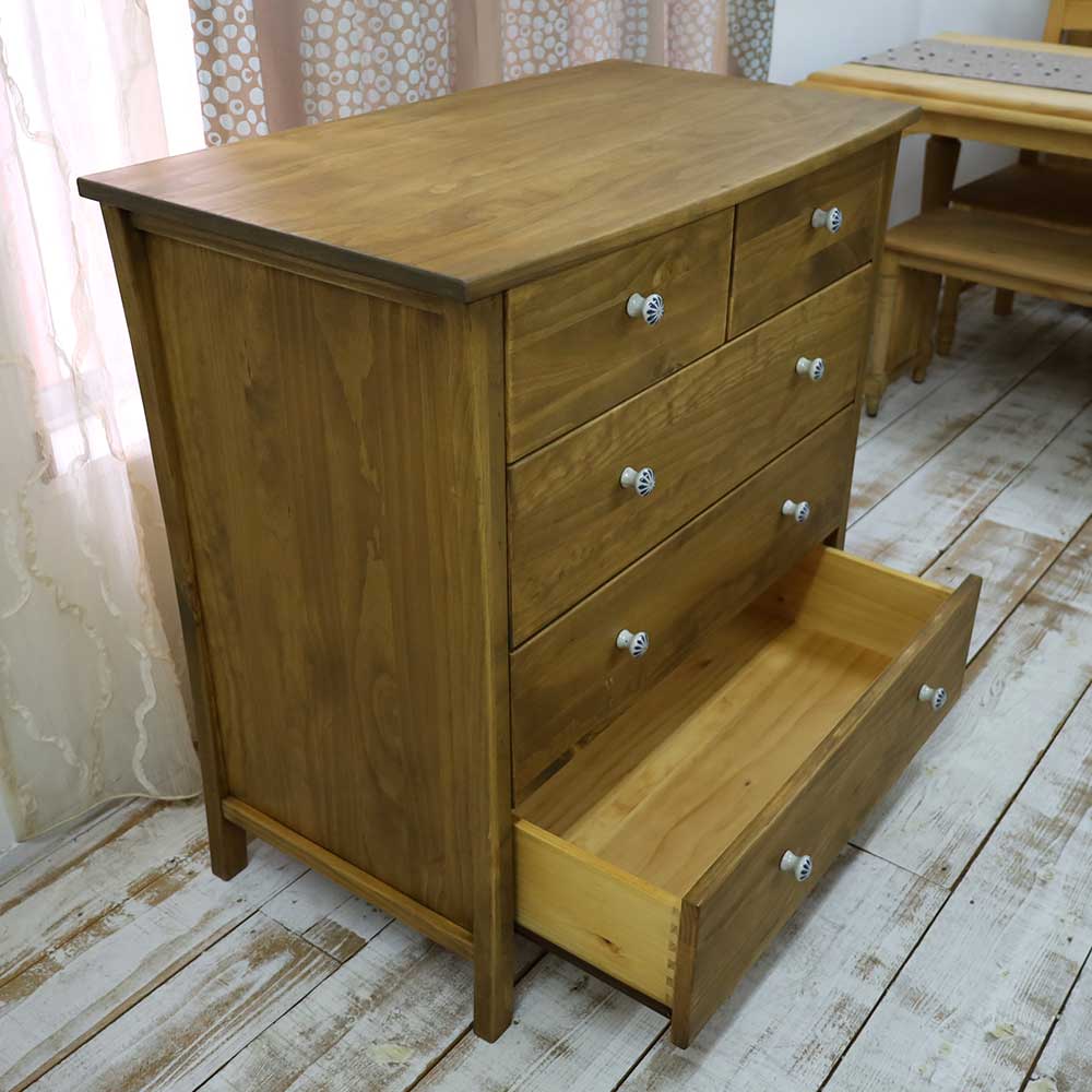 ゆるやかにカーブした天板や脚のデザインと本体と同じパイン木製取手が人気のカントリー家具シリーズです。