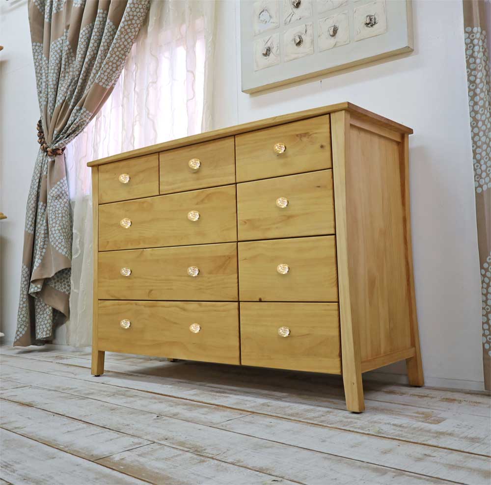 ナチュラルカントリーでかわいい巾130cm高さ90cmカントリーパインミドルチェストです♪パイン無垢材と無垢横接ぎ材・自然塗料仕上げの柔らかい肌触りと小物も洋服をたくさん収納出来る大容量の収納力が人気の整理ダンスです。