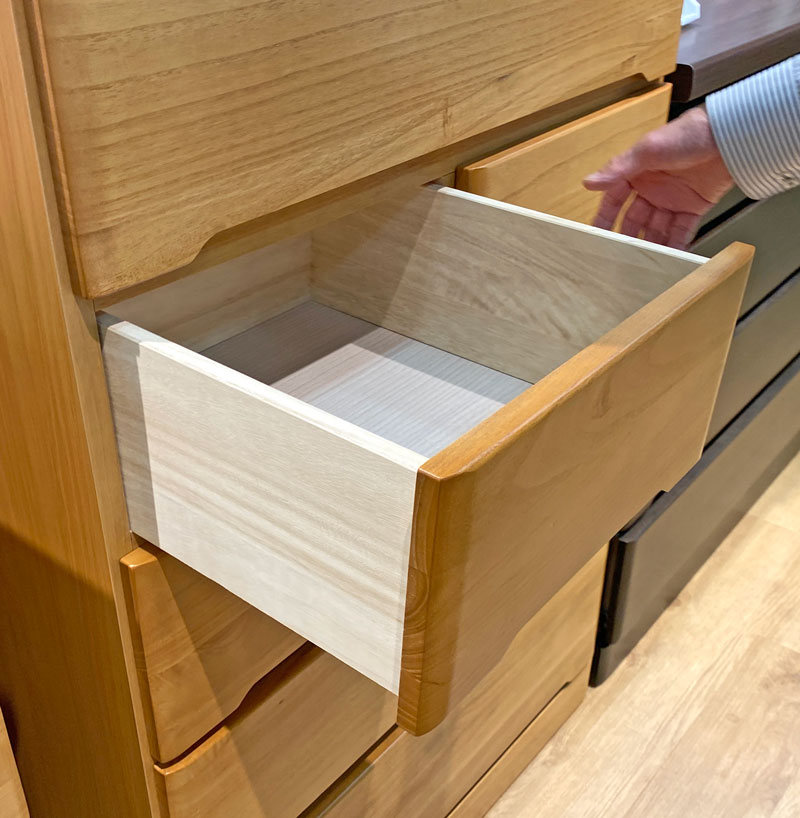 ビスや大量の接着剤を多用せず、天然の木の特性と加工技術を生かして強度と低ホルムアルデヒド、低化学物質の家具の造りで収納するものの安全と使う人の健康に配慮した造りになっています。